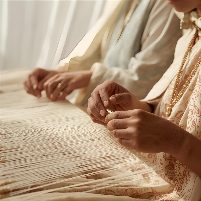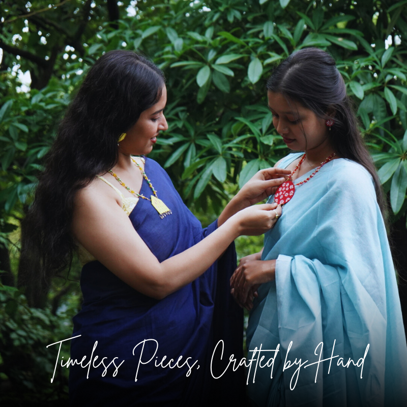 Every piece at Katha is handcrafted by skilled artisans and local women — from weavers to painters, each hand contributes to preserving a craft and a culture. We don’t just make products; we build connections between tradition and the woman who wears it.